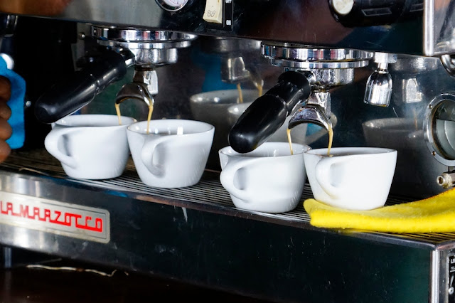 The session begins....The barista explains what their coffee 'plan' for the session is and fills the judges in on what very specific tastes they are going to encounter. The barista can be as chatty as they like but they had better not lose track of what they are doing. 15 minutes goes by quickly. Once served, the sensory judges first check the 'crema' of the espresso -- does it cover the entire glass? are their breaks? does it 'stretch'? is it persistent? Next, how does it taste? Like they set it on high and walked away to chat or like it was extracted for the 'perfect' 27 seconds? (each roast/blend has their own optimal extraction time). The judges then spoon thru the crema with three short strokes and then take 2 sips. They note the taste scores based on their experience and rate the espresso also against what the barista told them. If they said it would be lemony and it isn't, the score reflects the omission.